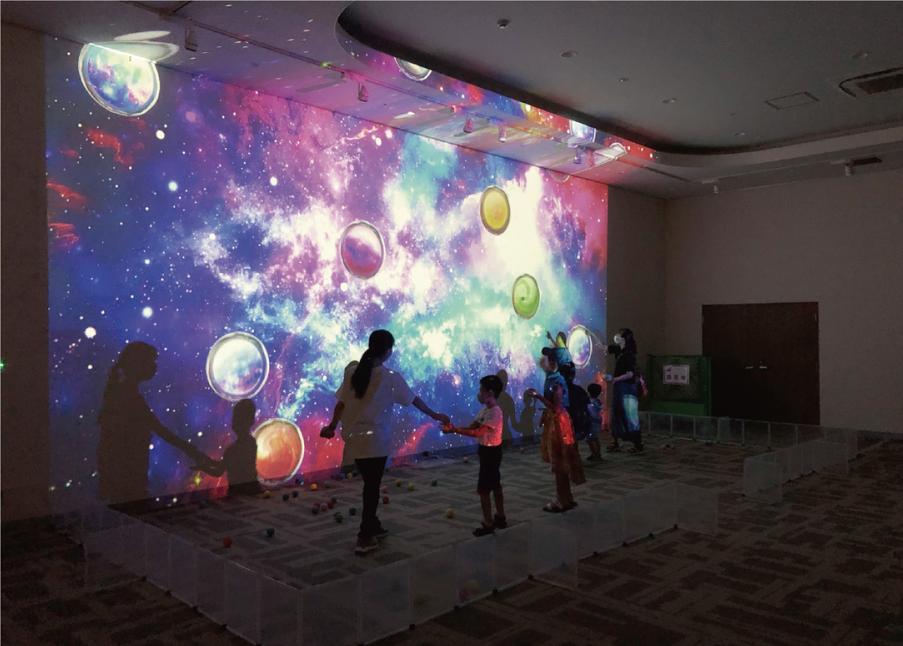 プロジェクションマッピングを使った音と映像のアトラクション『Asobeats♪』を実施いたしました。 動物のキャラクターを足でふんづけて遊ぶ『動物追いかけっこ』、お客様の動きに合わせてキャラクターが動く『大きな魔法のかべ』、 流れる惑星にボールを当てて遊ぶ『プラネットハント』などのアトラクションは、お子様だけでなく、大人にも楽しんでいただけました。